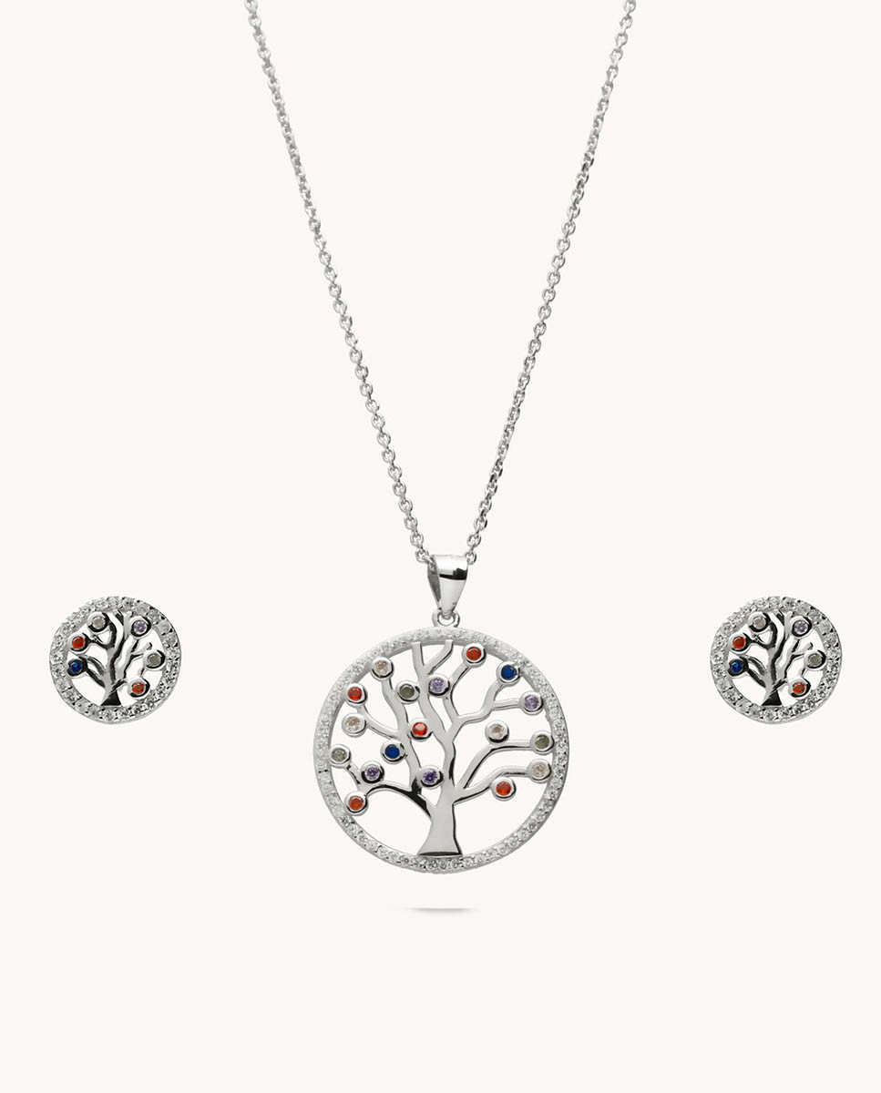 Set de plata de ley 925 bañada en rodio compuesto por pendientes y colgante de árbol de la vida con circonitas blancas y multicolor. Pendientes con cierre de presión y colgante con cadena de 45 cms y cierre tipo reasa.