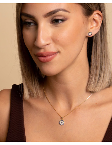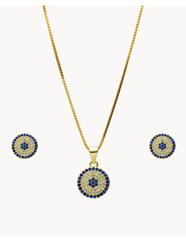 Set de plata de ley 925 bañada en oro 18K compuesto por pendientes de 8,5 mm de diámetro y colgante de 11 mm de diámetro, combina circonitas azules y circonitas blancas. Pendientes con cierre de presión y colgante con cadena de 40 cms más 5 cms de alargador y cierre tipo reasa.