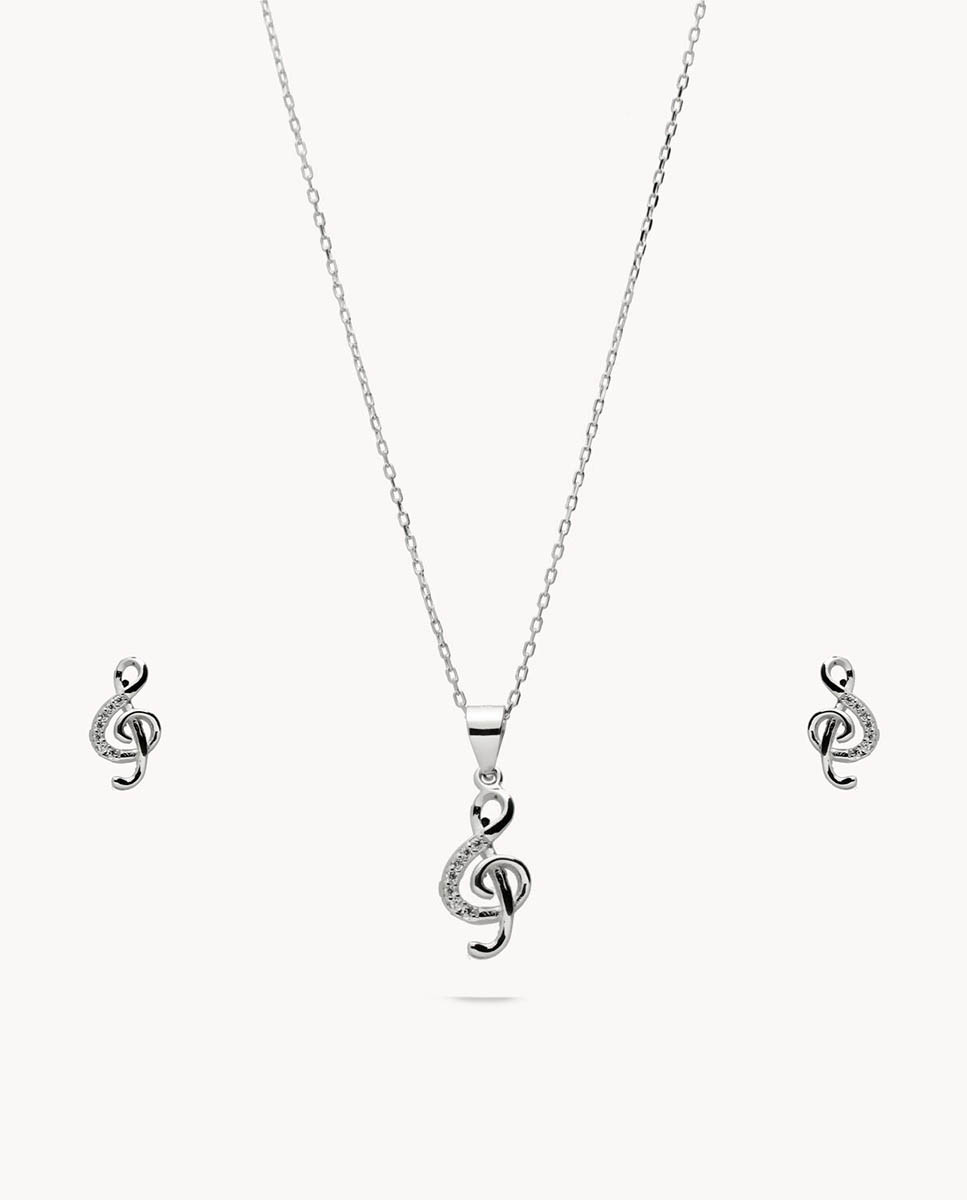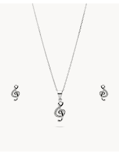 Set de plata de ley 925 bañada en rodio compuesto por pendientes y colgante de clave de sol con circonitas blancas. Pendientes con cierre de presión y colgante con cadena de 40 cms más 4,5 cms de alargador y cierre tipo reasa.