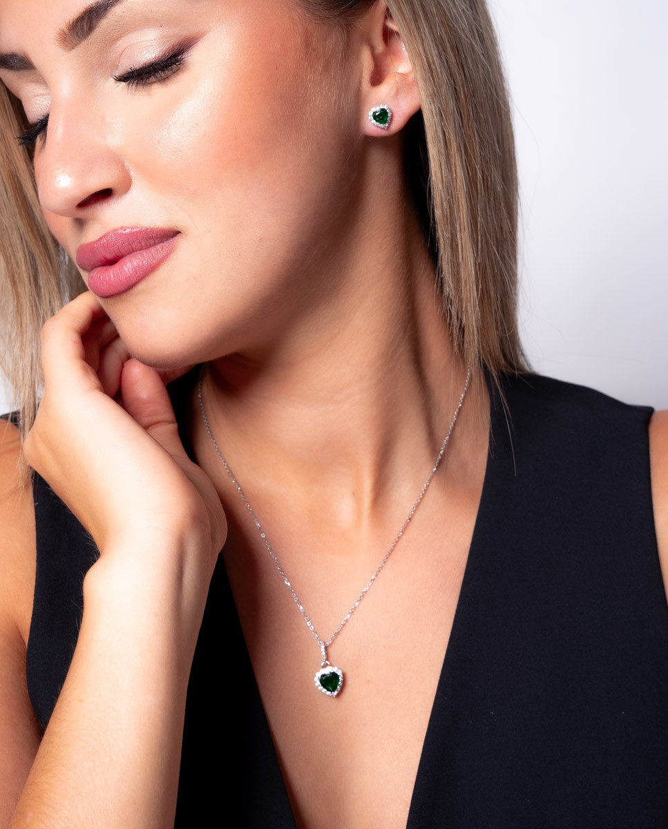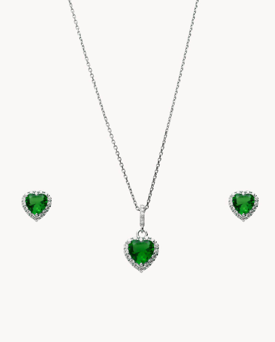 Set de plata de ley 925 bañada en rodio compuesto por pendientes y colgante en forma de corazón con circonita central color esmeralda rodeada por circonitas blancas.