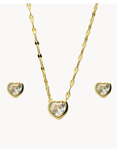 Set de plata de ley 925 bañada en oro compuesto por pendientes y colgante de corazón de 7 mm x 7 mm (ancho por alto) con circonita blanca. Pendientes con cierre de presión y colgante con cadena de 40 cms más 5,5 cms de alargador y cierre de mosquetón.