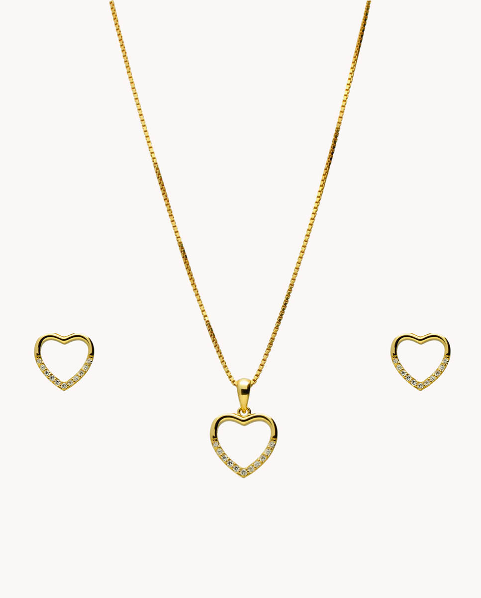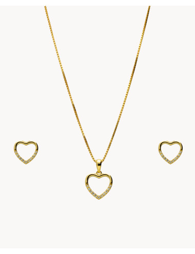Set de plata de ley 925 bañada en oro 18K compuesto por pendientes y colgante de 10 mm x 10 mm (ancho por alto) en forma de corazón con detalle de circonitas blancas. Pendientes con cierre de presión y colgante con cadena de 40 cms más 5 cms de alargador y cierre tipo reasa.