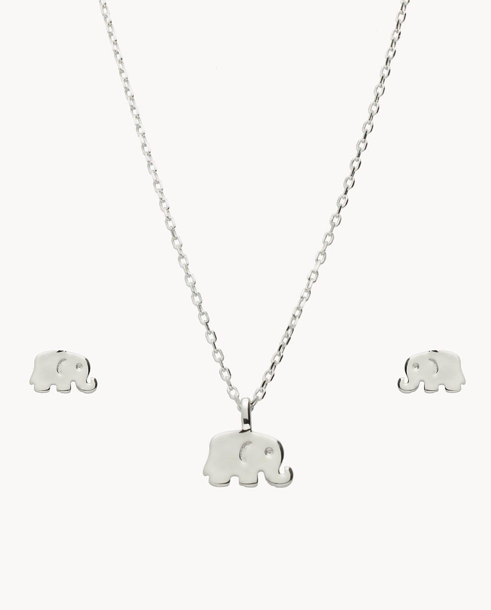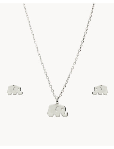 Set de plata de ley 925 bañada en rodio compuesto por pendientes y colgante de elefante. Pendientes con cierre de presión y colgante con cadena de 40,5 cms más 5 cms de alargador, cierre tipo reasa.