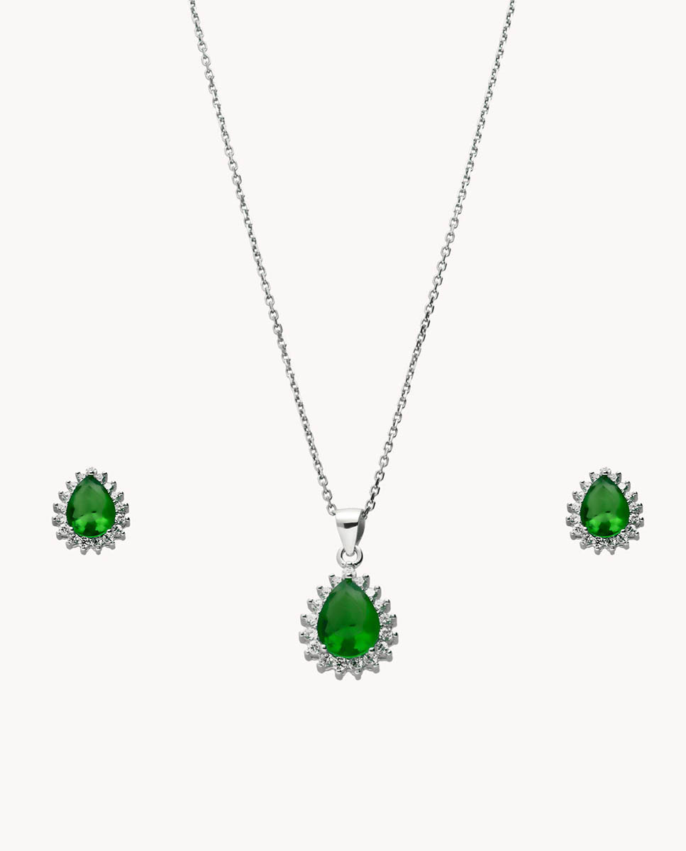 Set de plata de ley 925 bañada en rodio compuesto por pendientes y colgante en forma de gota con circonita central color esmeralda rodeada por circonitas blancas.