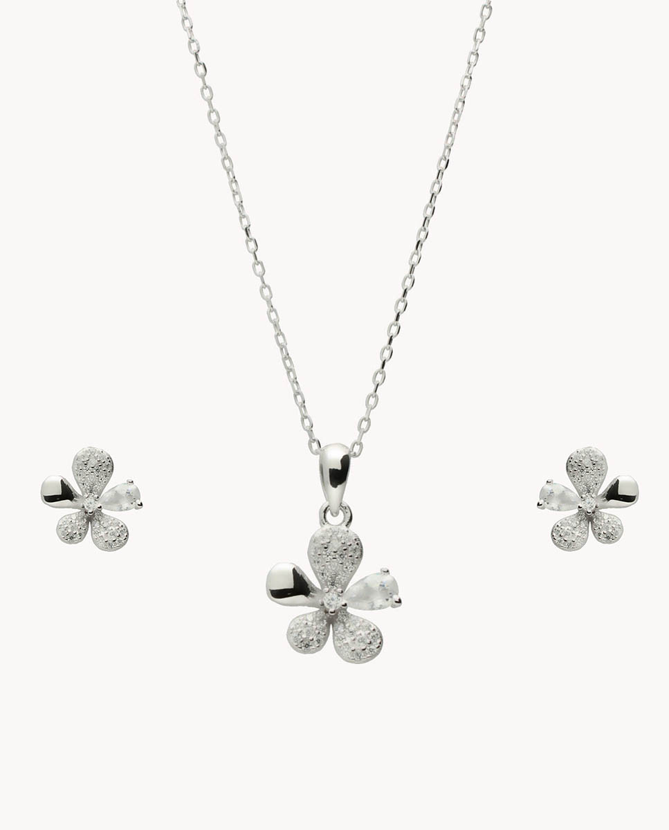 Set de pendientes y colgante flor brilla de plata de ley 925 bañada en rodio
