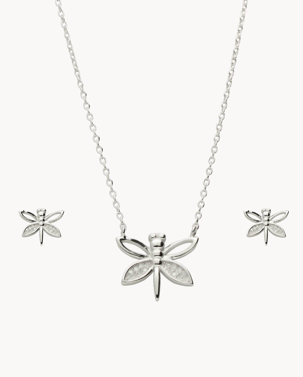 Set de plata de ley 925 bañada en rodio compuesto por pendientes y collar de libélula con circonitas blancas. Pendientes con cierre de presión y colgante con cadena de 40 cms más 5 cms de alargador y cierre tipo reasa.