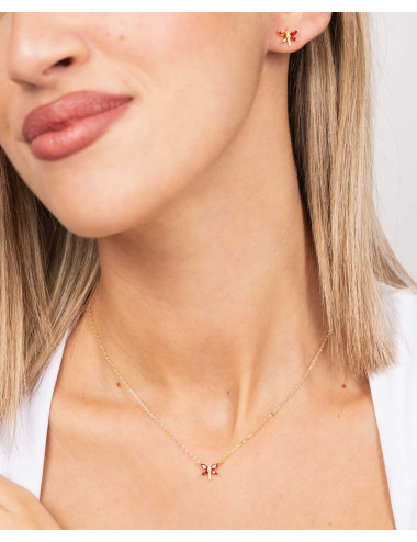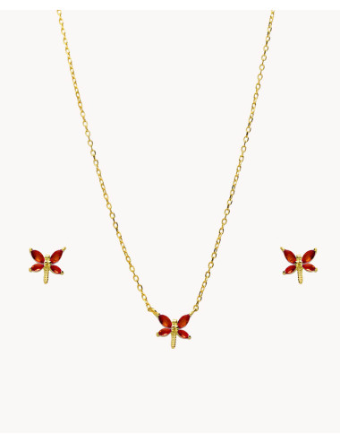 Set de plata de ley 925 bañada en oro 18K compuesto por pendientes y colgante con circonitas color granate en forma de libélula de 8 mm x 8 mm (ancho por alto). Pendientes con cierre de presión y colgante con cadena de 40 cms más 5 cms de alargador y cierre de mosquetón.