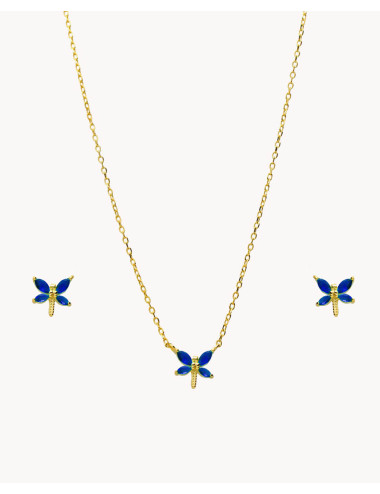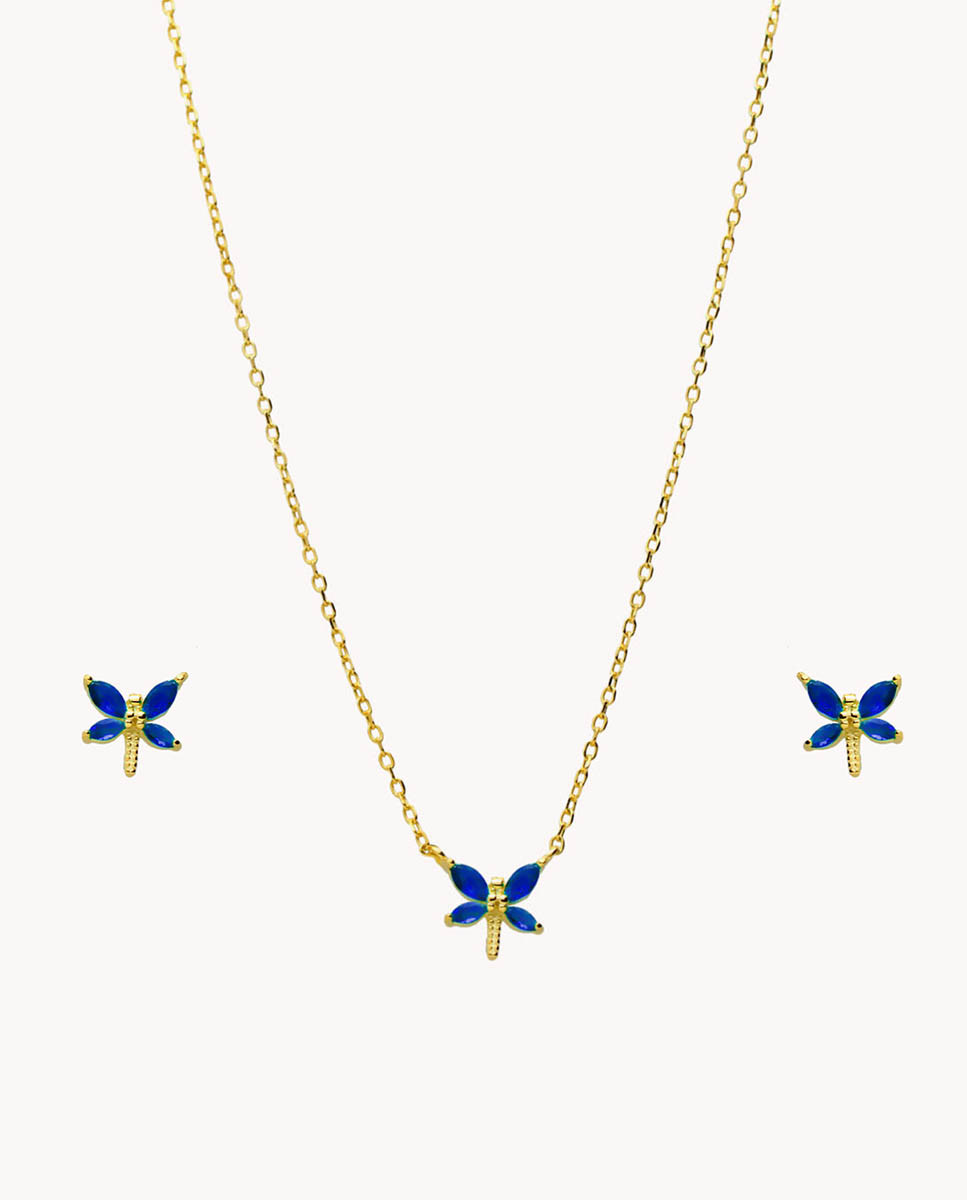 Set de plata de ley 925 bañada en oro 18K compuesto por pendientes y colgante con circonitas color zafiro en forma de libélula de 8 mm x 8 mm (ancho por alto). Pendientes con cierre de presión y colgante con cadena de 40 cms más 5 cms de alargador y cierre de mosquetón.