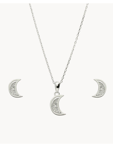 Set de plata de ley 925 bañada en rodio compuesto por pendientes y colgante de luna con circonitas blancas. Pendientes con cierre de presión y colgante con cadena de 40 cms más 5 cms de alargador, cierre tipo reasa.