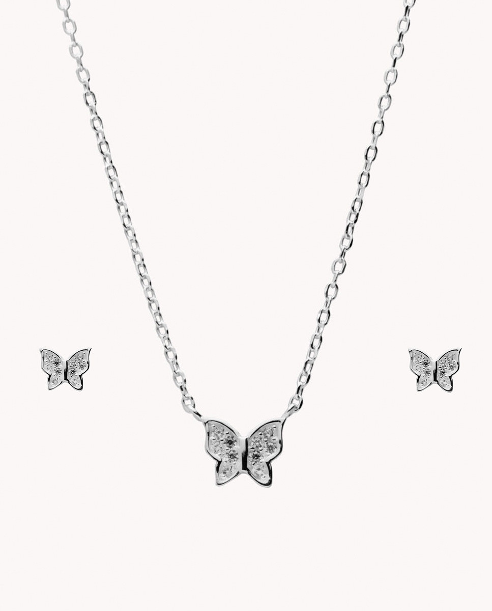 Set de plata de ley 925 bañada en rodio compuesto por pendientes y colgante de mariposa con circonitas blancas. Pendientes con cierre de presión y colgante con cadena de 40 cms más 5 cms de alargador, cierre de mosquetón.