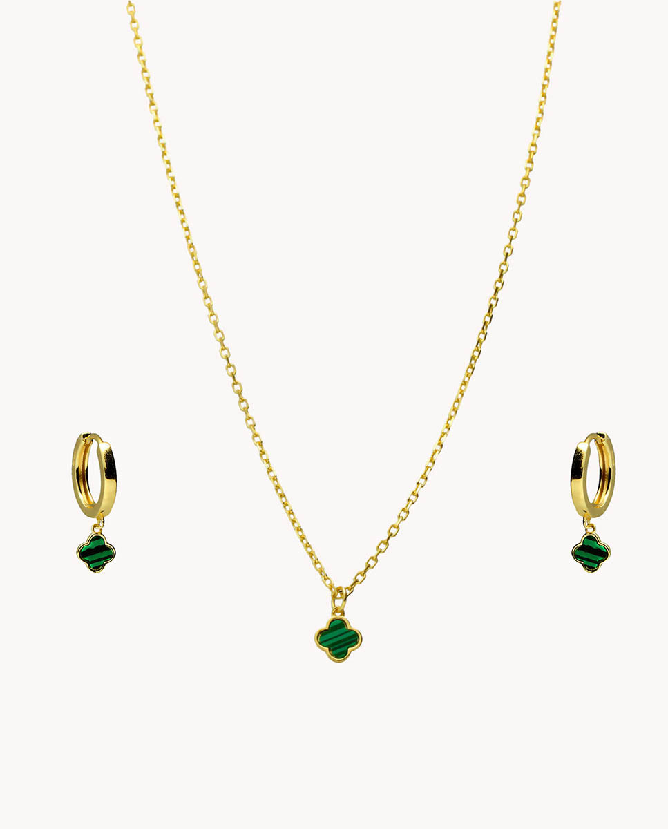 Set de pendientes y colgante mini flor malaquita de plata de ley 925 bañada en oro
