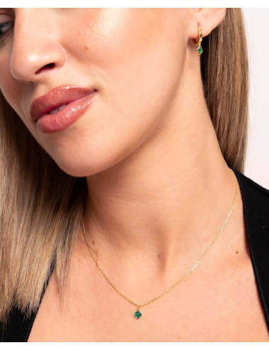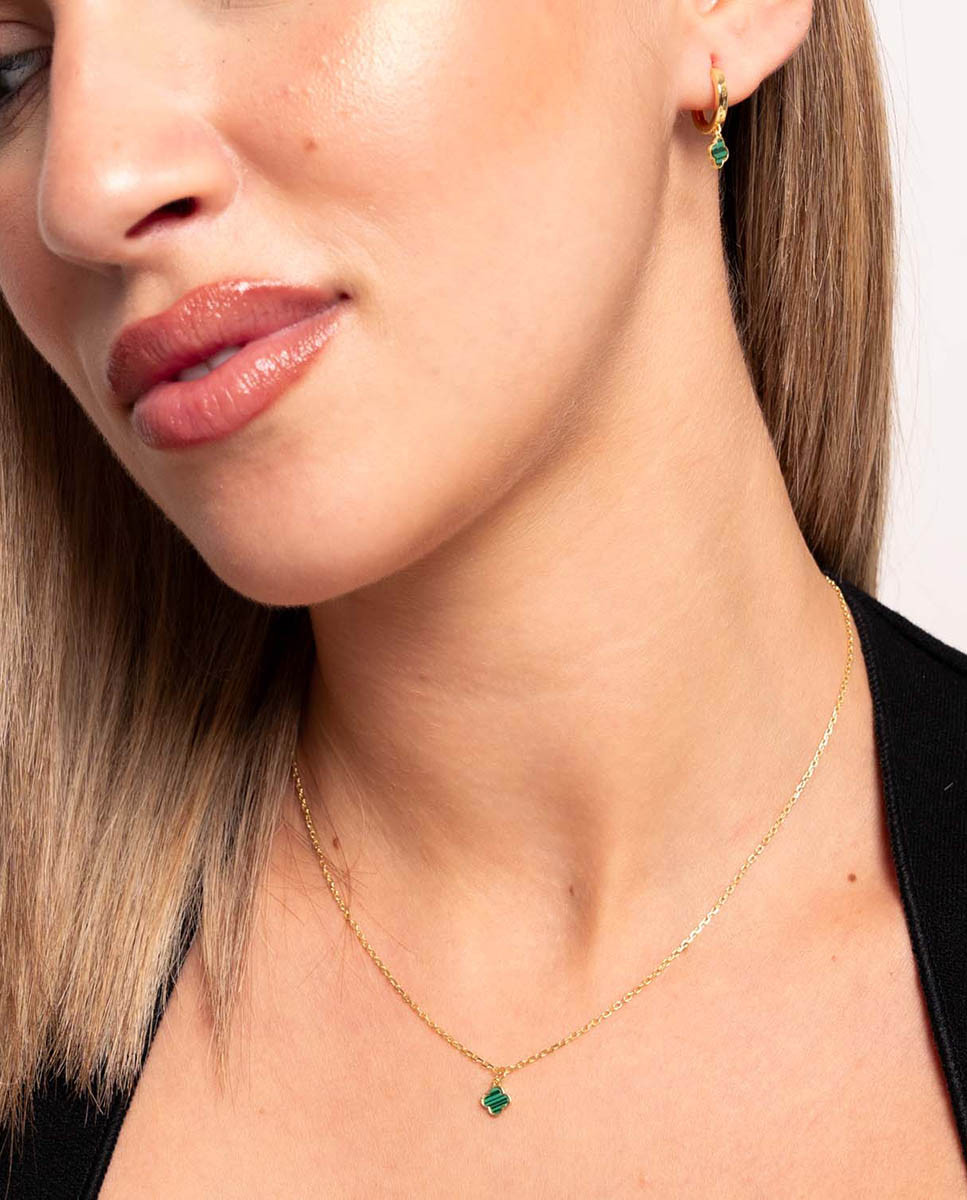 Set de plata de ley 925 bañada en oro de 18K compuesto por pendientes y colgante de malaquita verde en forma de flor de 6 mm x 6 mm (ancho por alto). Pendientes de aro de 10 mm de diámetro interior y 2 mm de grosor y colgante con cadena de 40 cms más 5 cms de alargador y cierre de mosquetón.