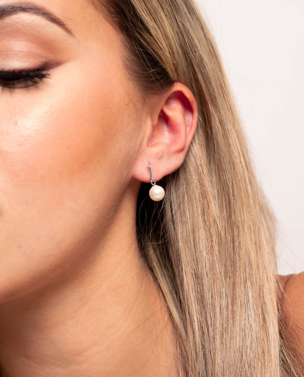 Set de plata de ley 925 bañada en rodio compuesto por pendientes y colgante con barra y perla cultivada de 8 mm de diámetro. Pendientes con cierre de presión y colgante con cadena de 40 cms más 5 cms de alargador y cierre de mosquetón.