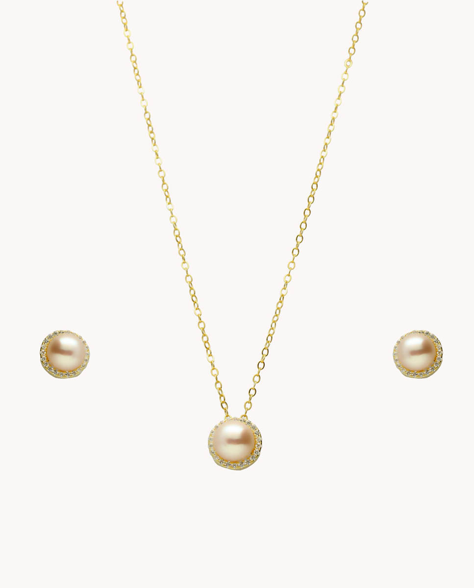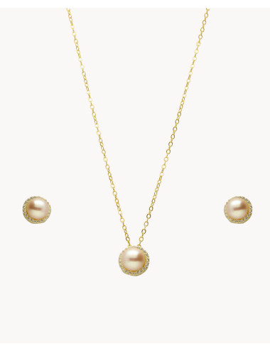 Set de plata de ley 925 bañada en oro compuesto por pendientes y colgante de perla cultivada de 6 mm de diámetro con circonitas blancas en todo su contorno. Pendientes con cierre de presión y colgante con cadena de 40,5 cms más 5 cms de alargador y cierre de mosquetón.