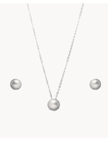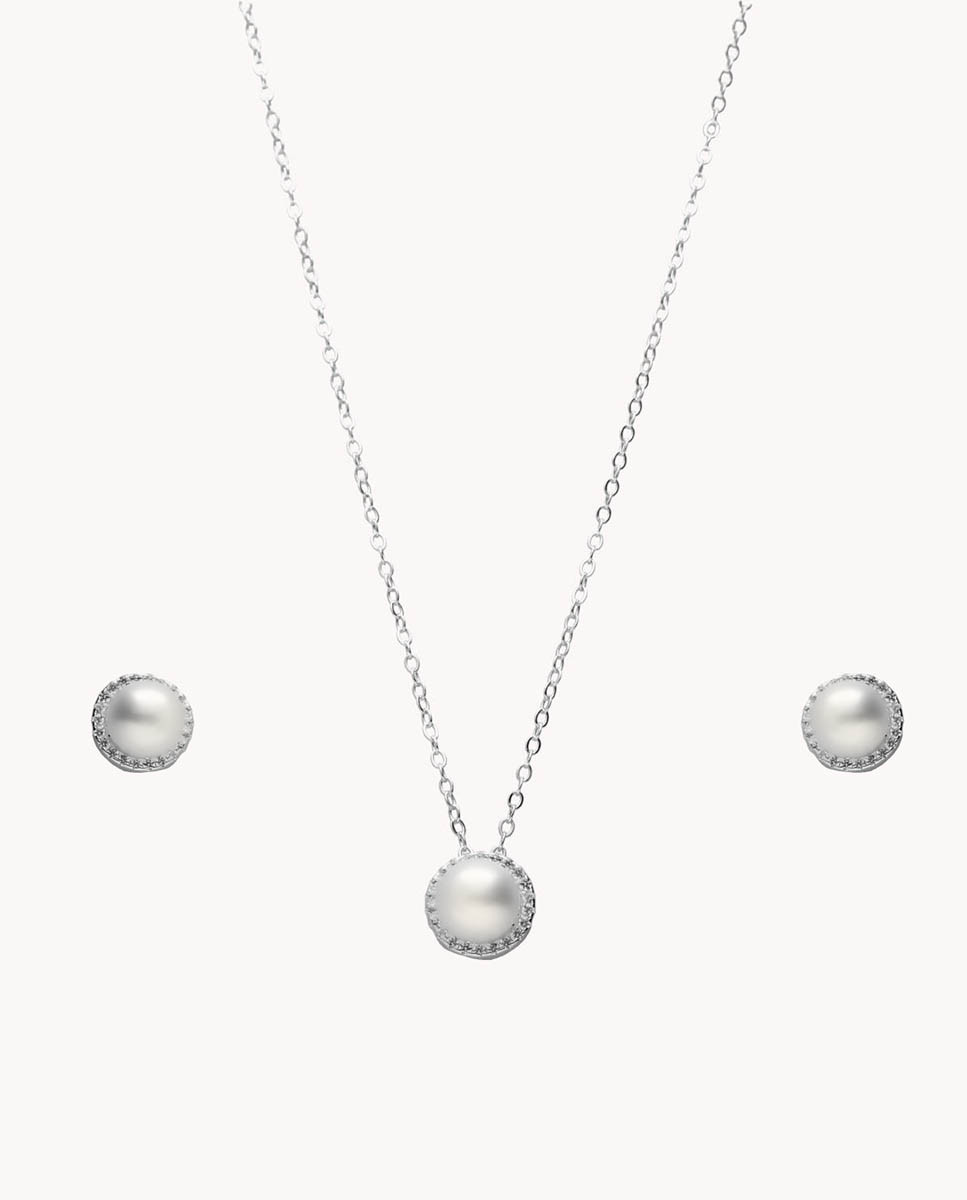 Set de plata de ley 925 bañada en rodio compuesto por pendientes y colgante de perla cultivada de 6 mm de diámetro con circonitas blancas en todo su contorno. Pendientes con cierre de presión y colgante con cadena de 40,5 cms más 5 cms de alargador y cierre de mosquetón.