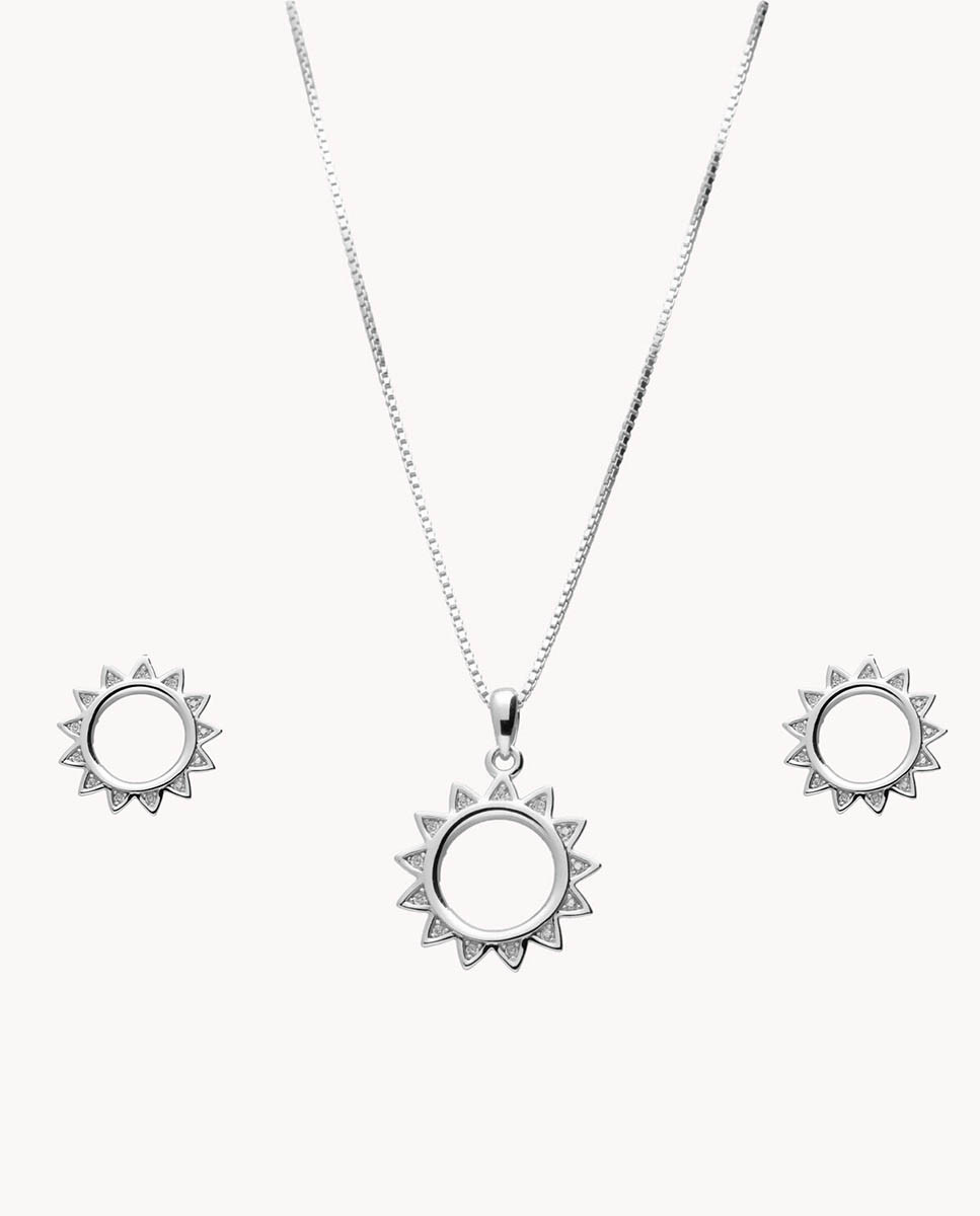 Set de plata de ley 925 bañada en rodio compuesto por pendientes y colgante de sol con circonitas blancas. Pendientes con cierre de presión y colgante con cadena de 45 cms y cierre tipo reasa.