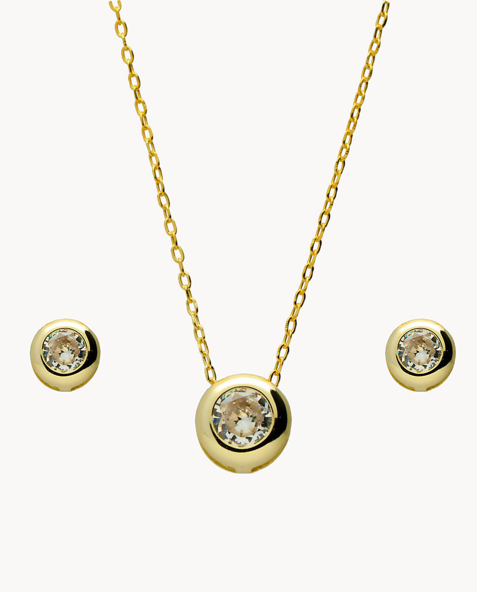 Set de plata de ley 925 bañada en oro 18K compuesto por pendientes con chatón de circonita blanca de 5 mm de diámetro y colgante con chatón de circonita blanca de 6 mm de diámetro. Pendientes con cierre de presión y colgante con cadena de 40 cms más 5 cms de alargador y cierre tipo reasa.