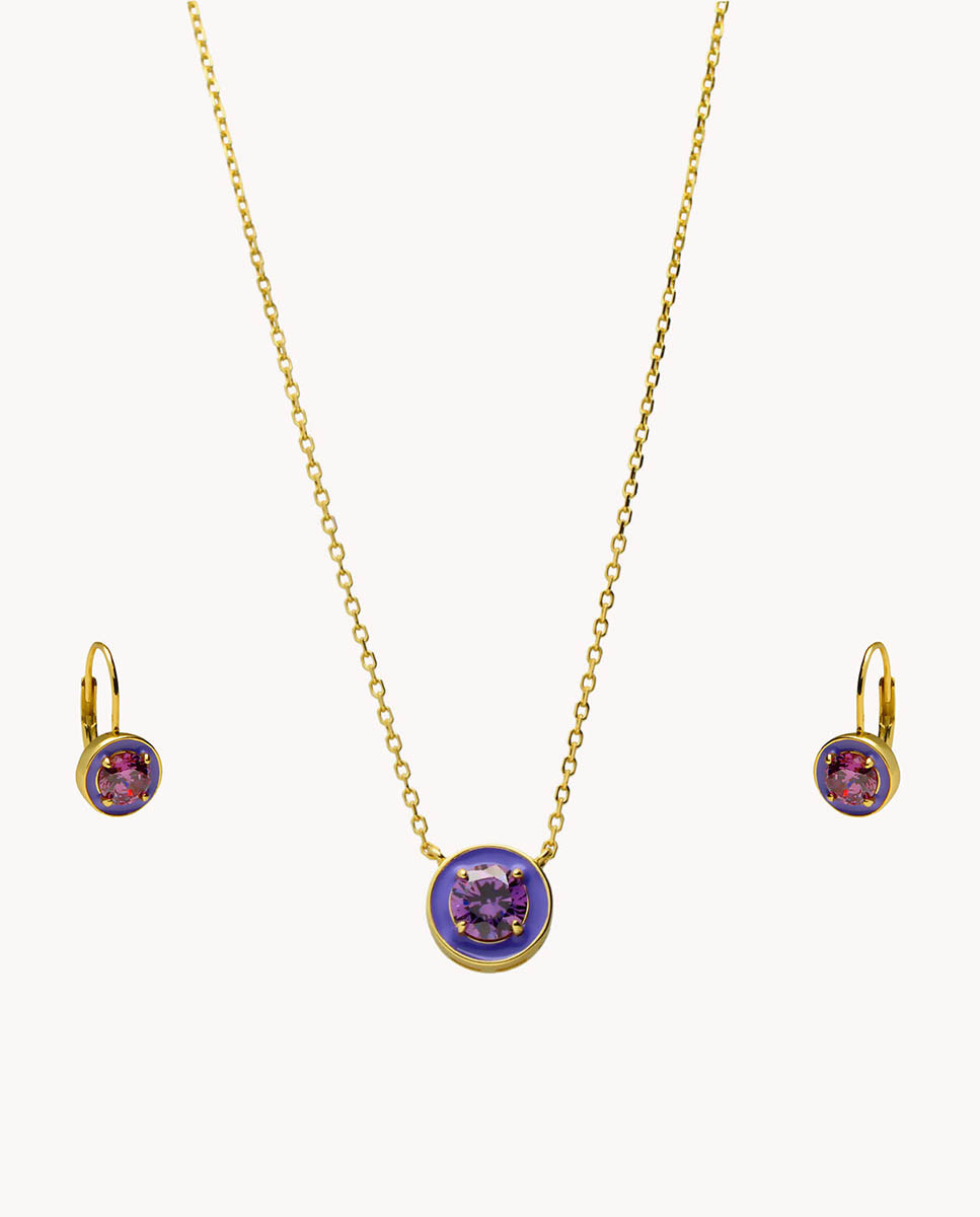 Set de plata de ley 925 bañada en oro 18K compuesto por pendientes y collar con circonita central color amatista y contorno esmaltado. Pendientes con cierre catalán de 8 mm de diámetro y circonita central de 5 mm de diámetro, collar de 10 mm de diámetro y circonita central de 6 mm de diámetro con cadena de 39,5 cms más 5 cms de alargador y cierre de mosquetón.