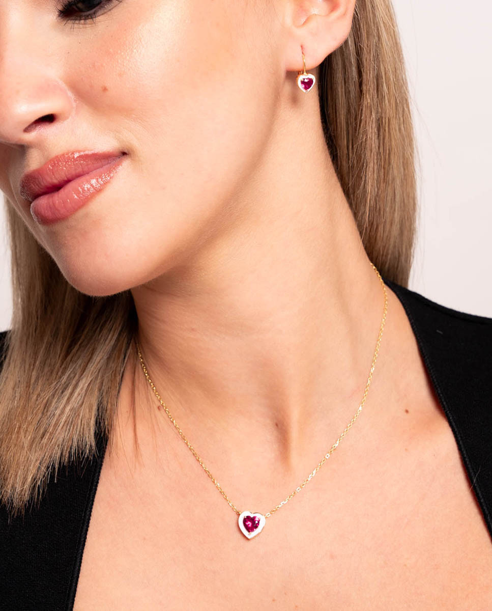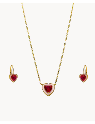 Set de plata de ley 925 bañada en oro 18K compuesto por pendientes y collar en forma de corazón con circonita central color rubí y contorno esmaltado. Pendientes con cierre catalán de 8 mm x 8 mm (ancho por alto) y collar de 11 mm x 11 mm (ancho por alto) con cadena de 40 cms más 5 cms de alargador y cierre de mosquetón.