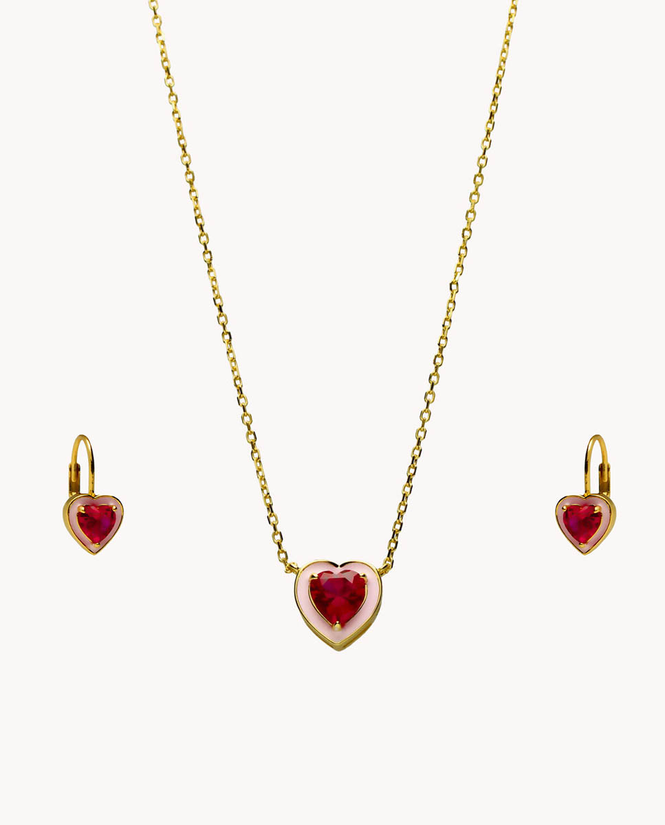 Set de pendientes y collar corazón rubí pasión de plata de ley 925 bañada en oro