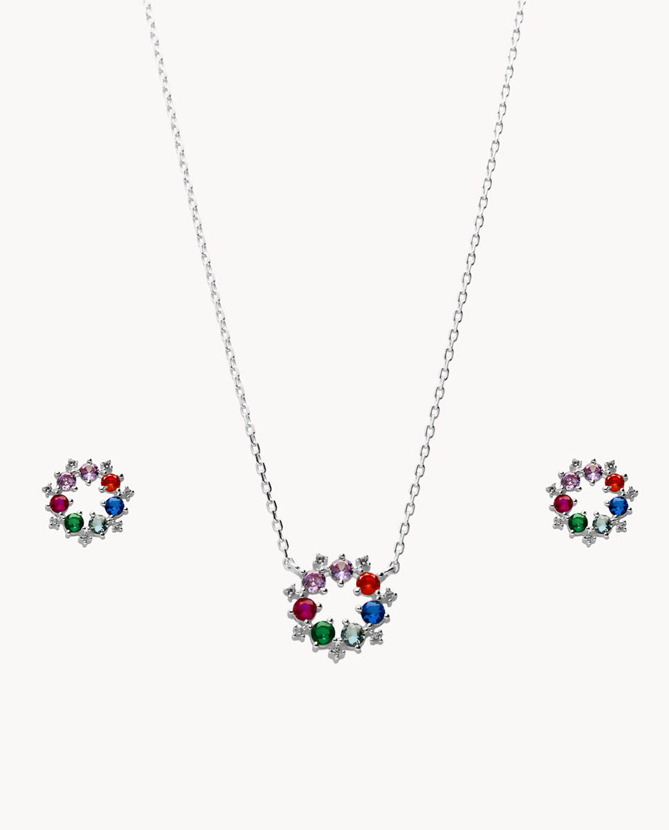 Set de plata de ley 925 bañada en rodio compuesto por pendientes y collar de karma con circonitas multicolor. Pendientes de 9 mm de diámetro con cierre de presión y collar de 13 mm de diámetro con cadena de 40 cms más 5 cms de alargador y cierre de mosquetón.