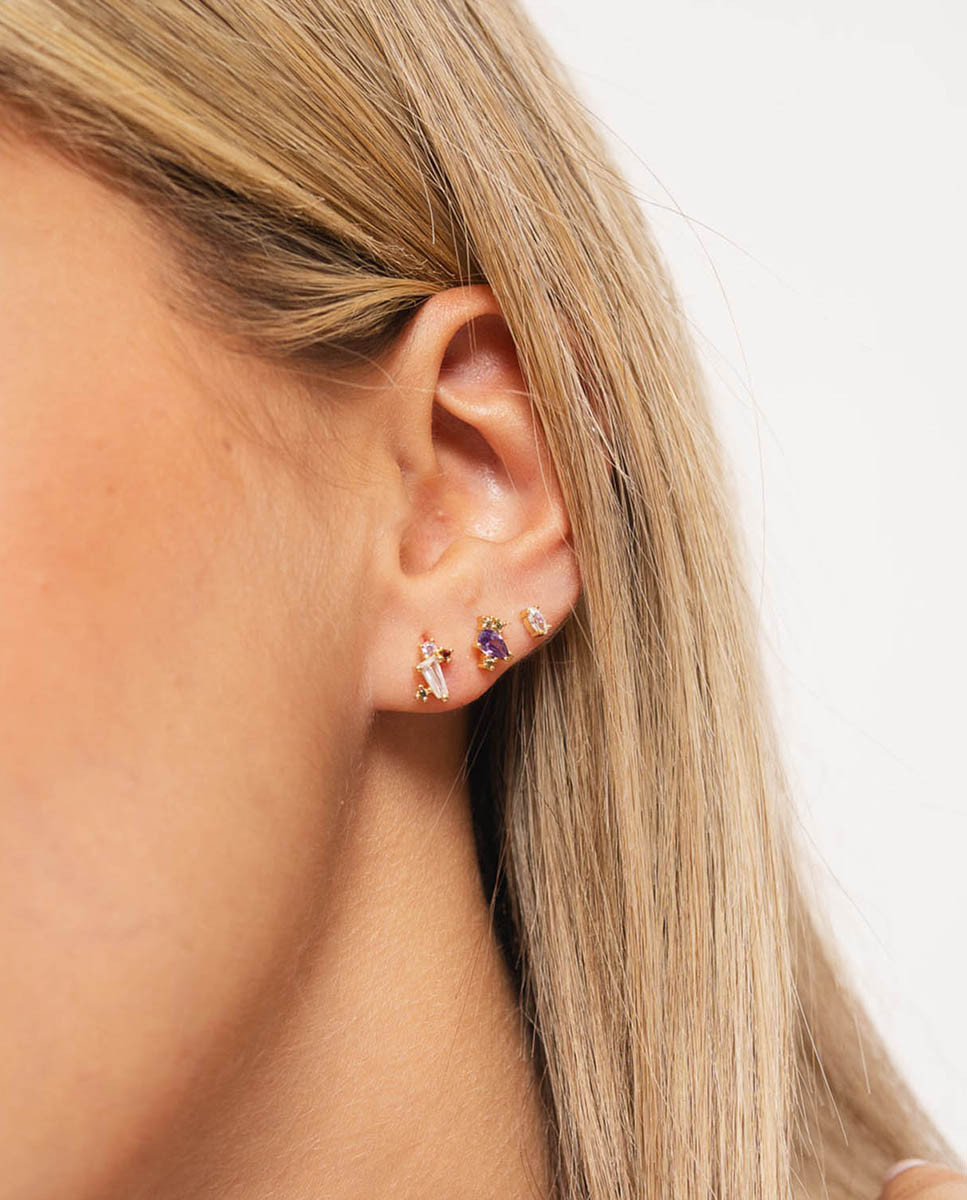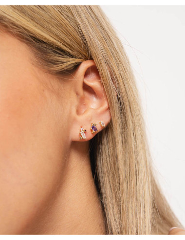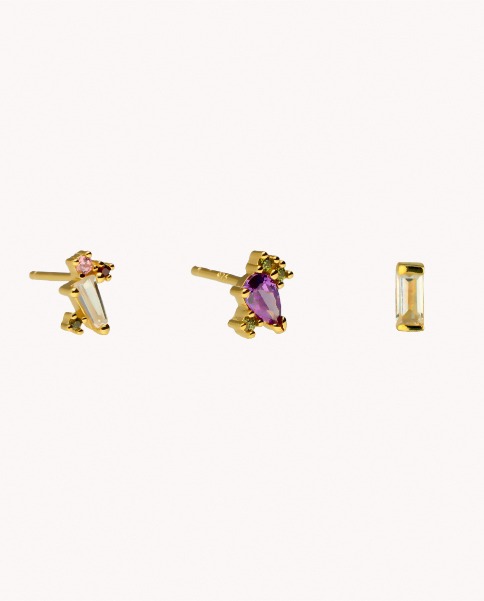 Set de tres pendientes individuales de plata de ley 925 bañada en oro 18K con circonitas multicolor y diferentes formas, cierre de presión.