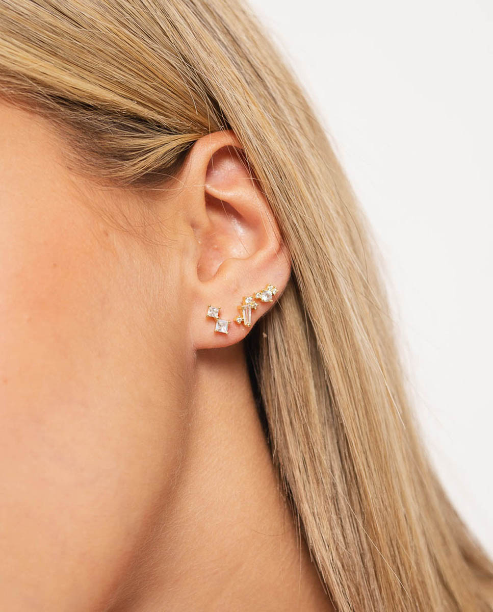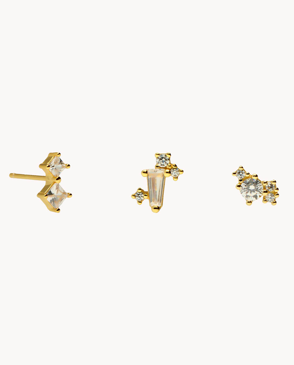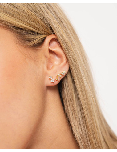 Set de tres pendientes individuales de plata de ley 925 bañada en oro 18K con circonitas blancas y diferentes formas, cierre de presión.