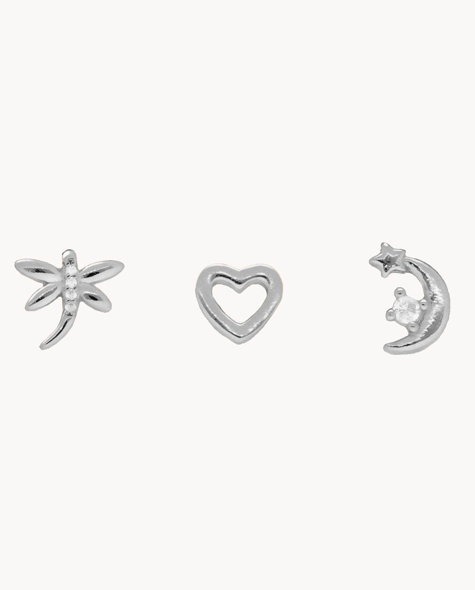 Set de tres pendientes individuales fly de plata de ley 925 bañada en rodio