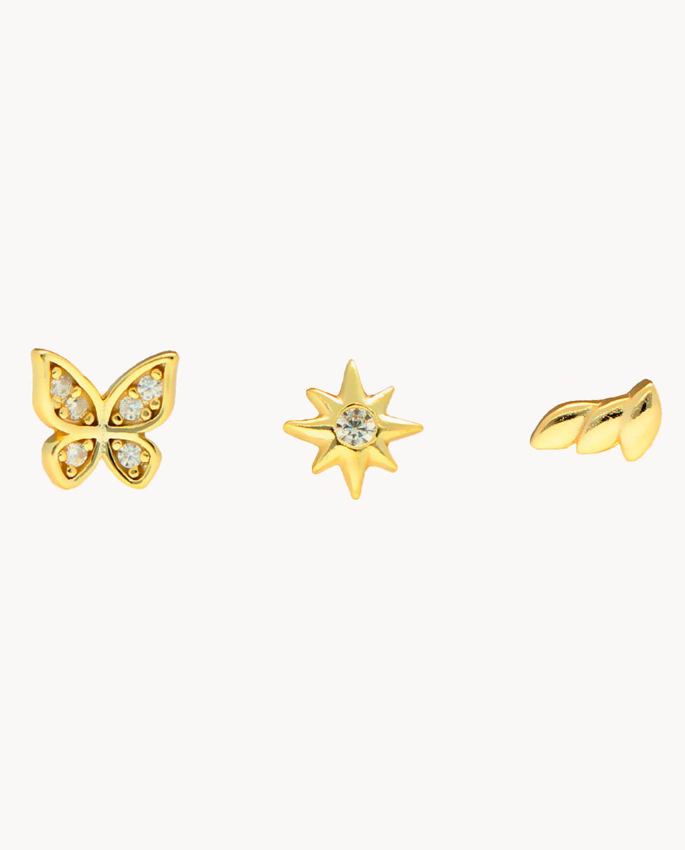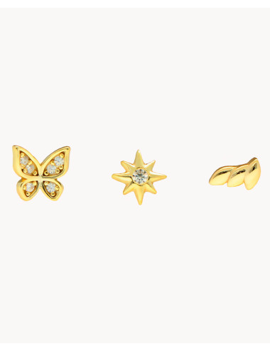 Set de tres pendientes individuales lucky de plata de ley 925 bañados en oro