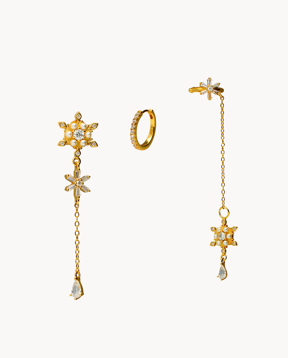 Set de tres pendientes de plata de ley 925 bañada en oro 18K compuesto por un aro abierto de 10 mm de diámetro con flor de circonitas y cadena de 4 cms con estrella de perlas y circonita en su extremo, otro pendiente con estrella de perlas y flor de circonitas con cadena de 2,5 cm finalizada en gota de circonita blanca y por último un aro de 11 mm de diámetro interior y 2 mm de grosor con circonitas blancas y cierre africano.