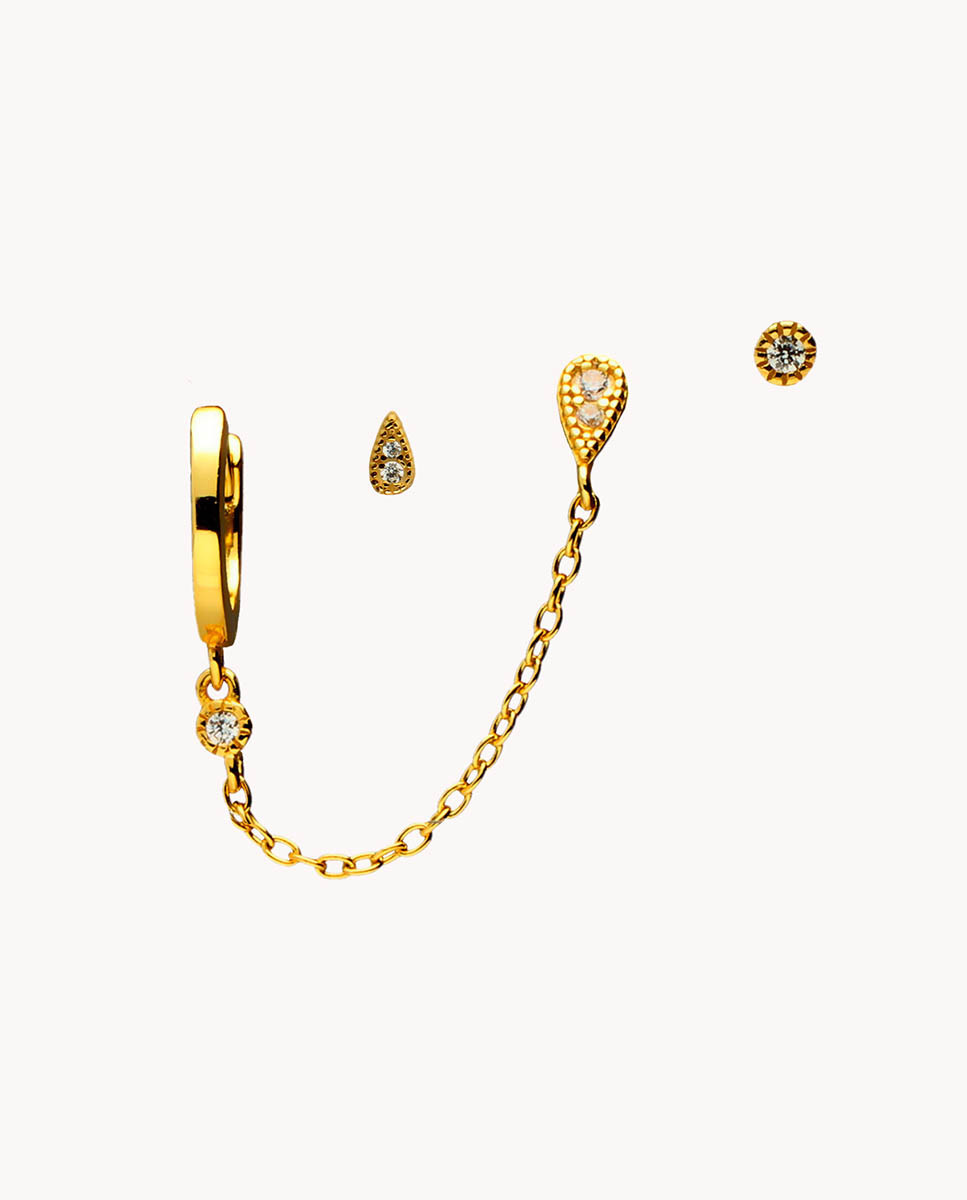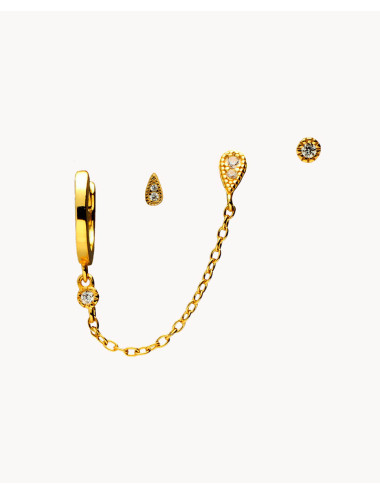 Set de tres pendientes de plata de ley 925 bañada en oro 18K compuesto por un aro de 9 mm de diámetro interior y 1,5 mm de grosor con cadena de 3,5 cms terminada en pendiente con forma de gota y circonitas blancas en su interior, una dormilona en forma de gota con circonitas blancas y un chatón de circonita blanca de 2 mm de diámetro.