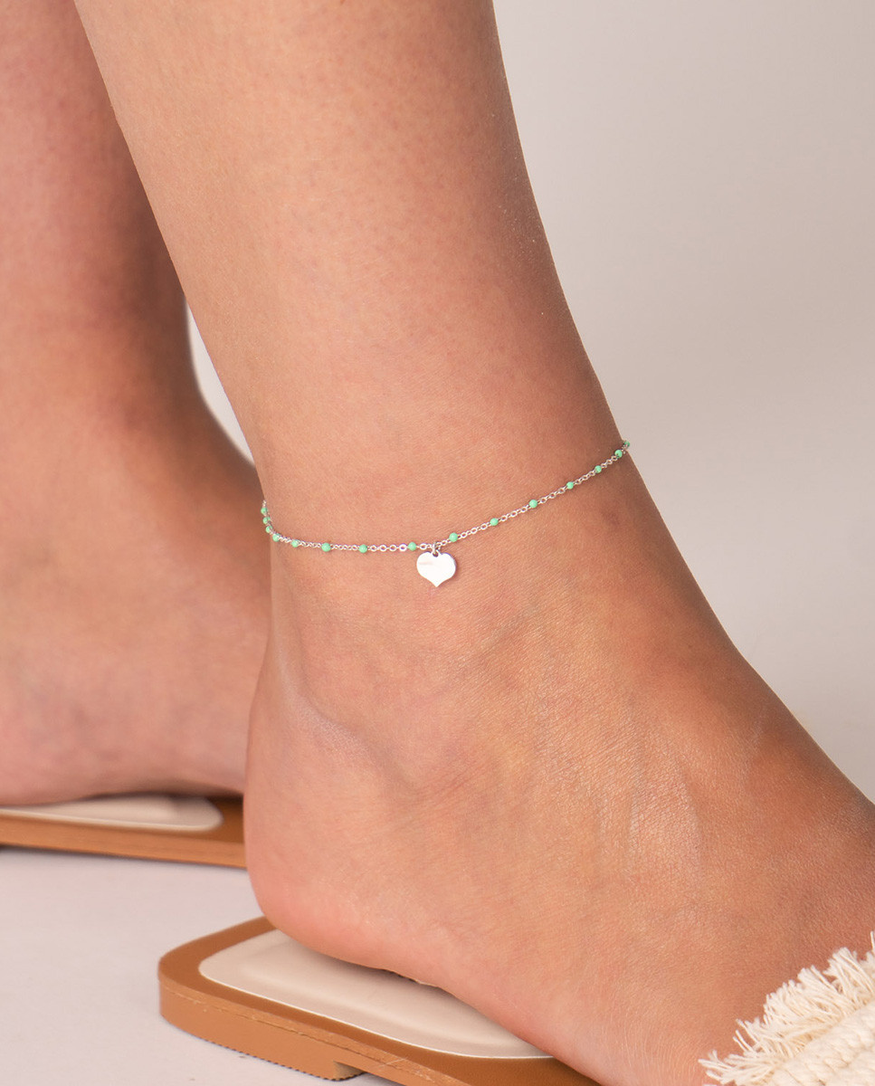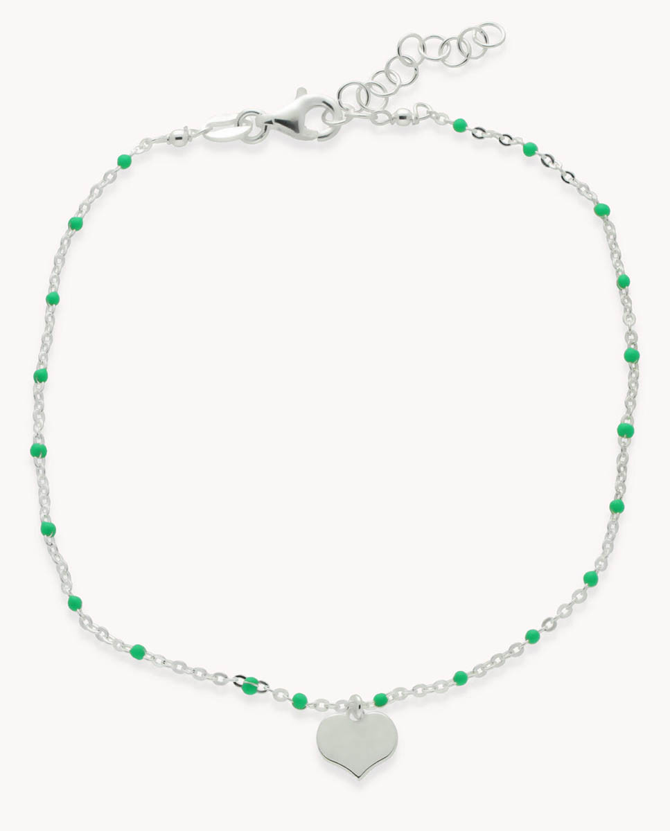 Pulsera tobillera de plata de ley 925 con colgante central de corazón de 7 mm x 6 mm (ancho por alto) y piedras verdes, largo de 21 cms más 3 cms de alargador y cierre de mosquetón.