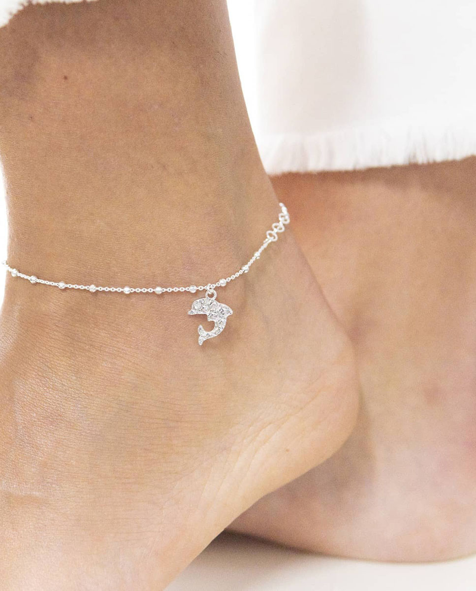 Tobillera de plata de ley 925 con colgante de delfín de 13 mm x 15 mm (ancho por alto), cierre de mosquetón y largo de 21 cms más 4 cms de alargador.