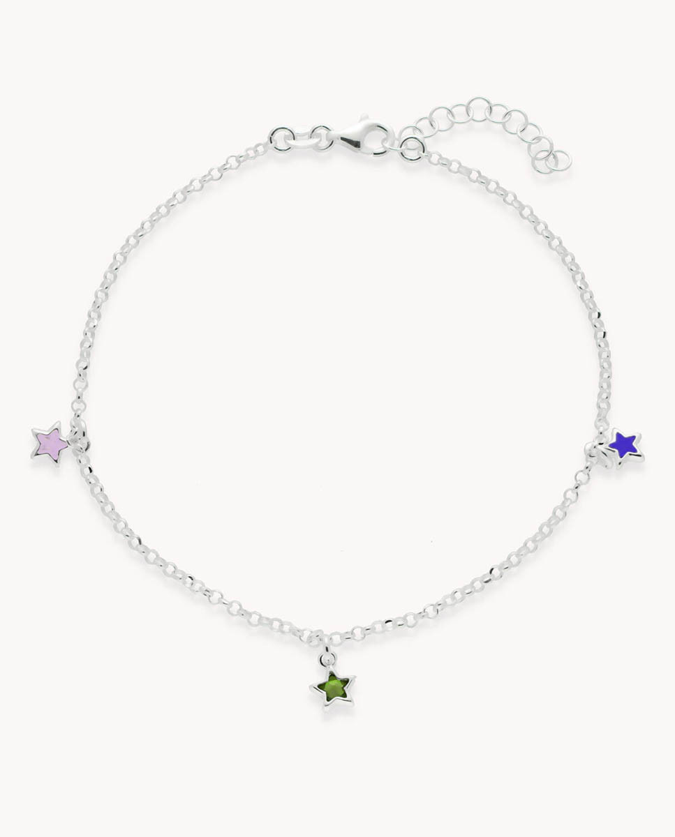 Tobillera de plata de ley 925 con colgantes de estrellas y cristales de Swarovski en su interior, largo de 21 cms más 3 cms de alargador y cierre de mosquetón.