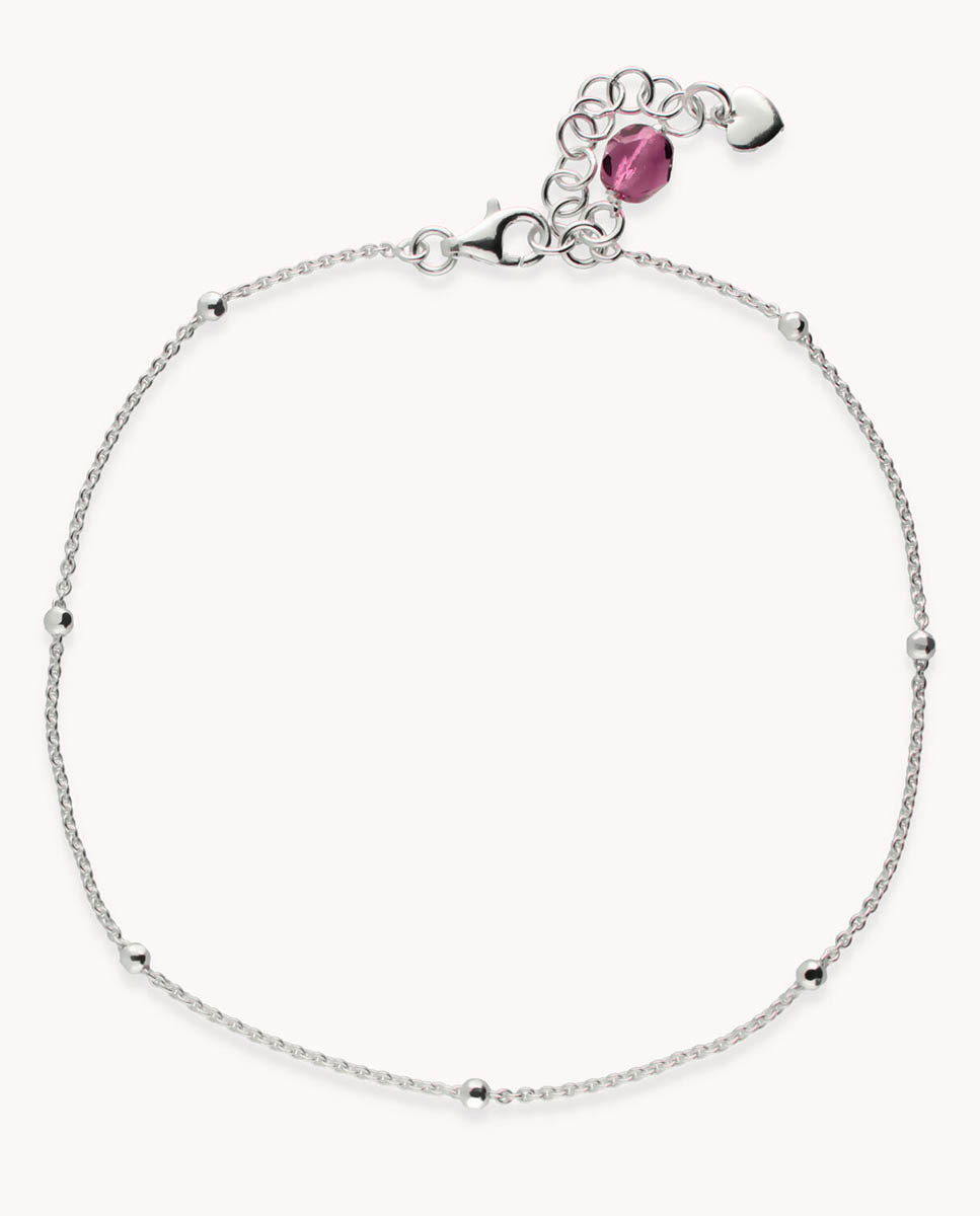 Tobillera de plata de ley 925 con bolitas en acabado diamantado de 2 mm de diámetro y colgante de piedra amatista, cierre de mosquetón y largo de 23 cms más 3,5 cms de alargador.