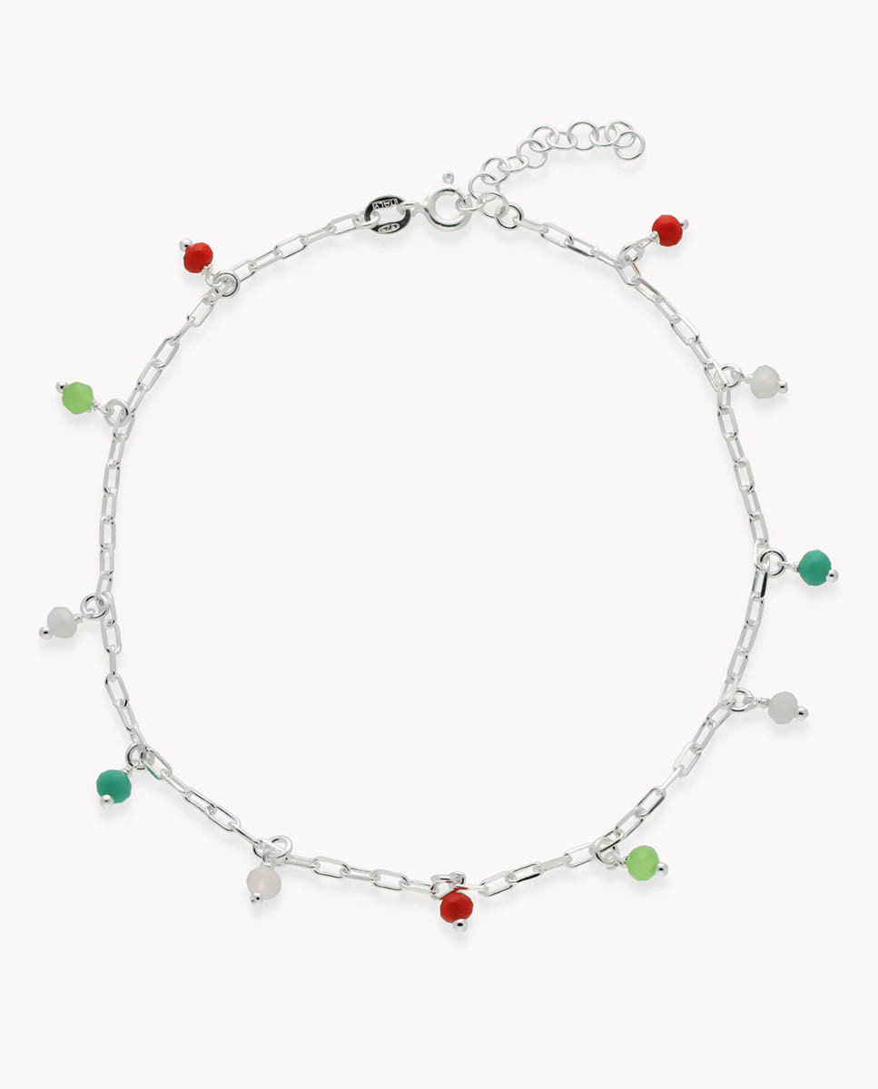 Tobillera de plata de ley 925 con multiples piedras multicolor, largo de 22 cms más 3 cms de alargador y cierre tipo reasa.
